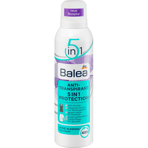 Balea Anti-Transpirant 5 in 1 Protection — це дезодорант, що забезпечує поліпшений захист від поту та запаху. Не залишає слідів і плям на одязі після використання, не викликає подразнення й алергічні реакції. Підходить для чутливої та нормальної шкіри.