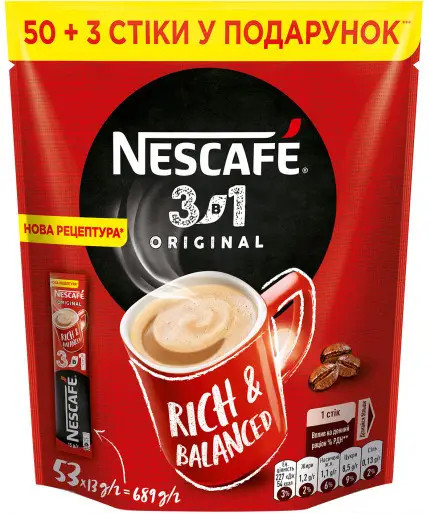 NESCAFE 3в1 Nescafe Original Rich&Balanced — інноваційний і сміливий, бомбічний кавовий мікс з сухим вершковим кремом та цукром, який надає напою пухку та високу пінку, яка заряджає на нестандартні рішення та приносить неімовірну насолоду. Вміст кави придає напою оригінальної міцності, який притаманний каві Nescafe, для любителів кави з нормальних збалансованним смаком.