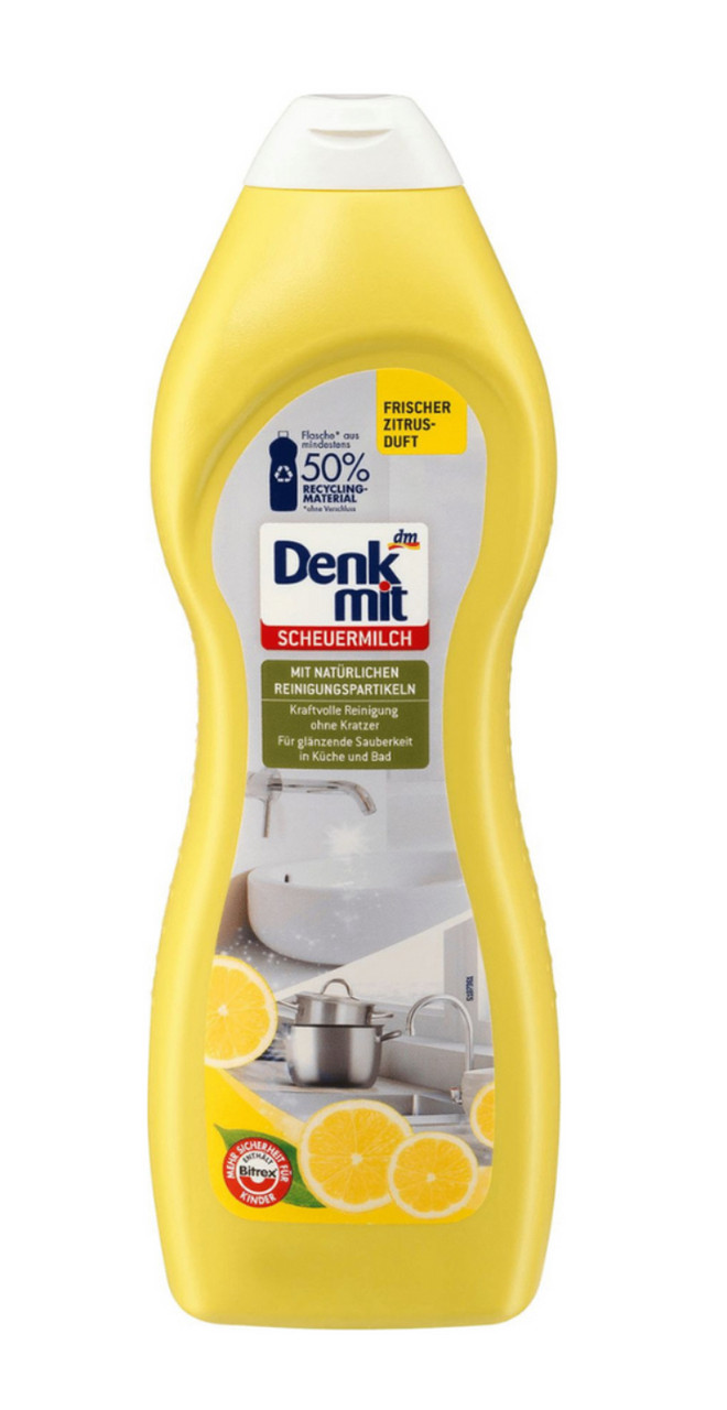 Активне молочко-емульсія для чищення різноманітних видів поверхней, як кухонні, так і ванна з душовою кабінкою у вас вдома Denkmit Scheuermilch Reinigungs (з ароматом лимону) 500 мл, засіб містить в основі натуральні очисні елементи (частинки) Mit naturlischen Reinigungs Spartikeln.