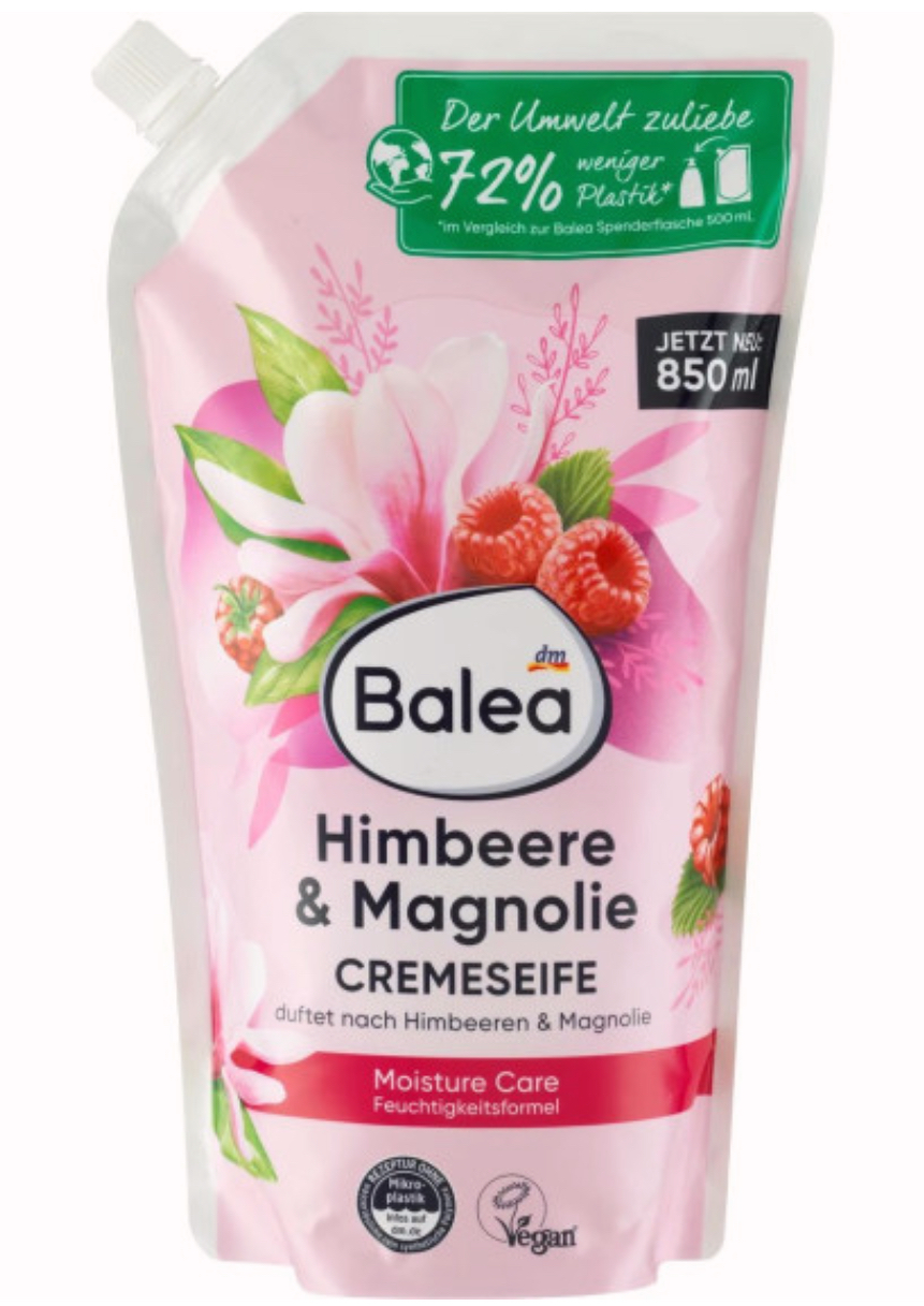 Рідке мило малина та магнолія запаска Balea, 750 мл (Німеччина) Зволожуюча формула догляду Пахне малиною та магнолією Дерматологічно підтверджена сумісність шкіри зволожуючі інгредієнти Крем-мило Balea м’яко очищає руки і помітно доглядає за ними щодня. Рідке мило малина та магнолія від Balea зберігає вологу: завдяки ніжній формулі догляду та зволожуючим інгредієнтам, воно підтримує природний баланс вологи вашої шкіри. Композиція без мікропластиків та водорозчинних, чисто синтетичних полімерів.