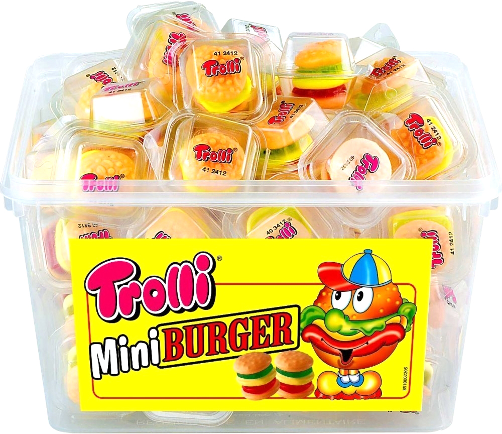 Желейні бургери Trolli Glotzer Mini Burger 60 шт Смачні гамбургери Trolli Party Burger Mini порадують кожного гостя вечірки. Фаст-фуд у солодкому вигляді з цукрової піни та фруктової гумки — ідеальне частування для вечірки. Інгредієнти глюкозний сироп; цукор; желатин; підкислювачі: лимонна кислота, молочна кислота; гелеутворювач: пектин; фарбувальні продукти (чорна смородина, чорна морква, куркума, сафлор, червона редька, червоний виноград, вишня, лимон, спіруліна); ароматизатори; Покривні речовини: бджолиний віск, білий і жовтий, карнаубський віск.