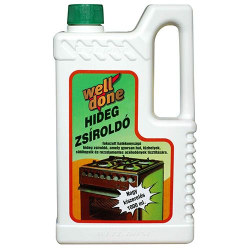 Знежирювач для кухні Well Done Zsiroldo 1000 мл Ефективний засіб-знежирювач для видалення складних забруднень на варочних поверхнях, духовках, пательнях, каструлях і поверхнях з нержавіючої сталі. Не наносити на мідні і алюмінієві поверхні. Застосування: нанести засіб в рукавичках, почекати 5-10 хвилин і змити водою. Жир розчиняється і його легко можна видалити. *Зовнішній вигляд упаковки (етикетка,кольорова гама), написи і зображення на ній можуть бути змінені виробником без попередження. Магазин не несе відповідальності за зміни, внесені виробником.