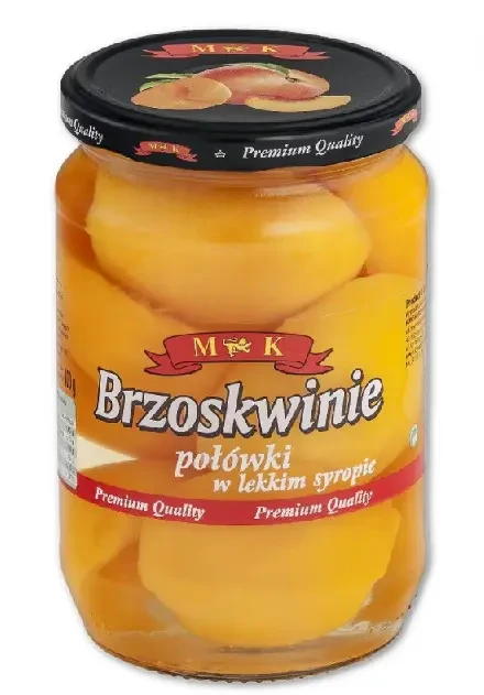 Персик консервований у сиропі половинками M&K 680g Персик консервований у сиропі половинками в c/б M&K (Польща), 680 г — досить великі кусочки (половинки) персика родом із Греції, в цукровому сиропі. Завдяки якісній технології виробництва зберегли форму, а також солодкий та насичений смак свіжого персика, хрумку структуру та текстуру.