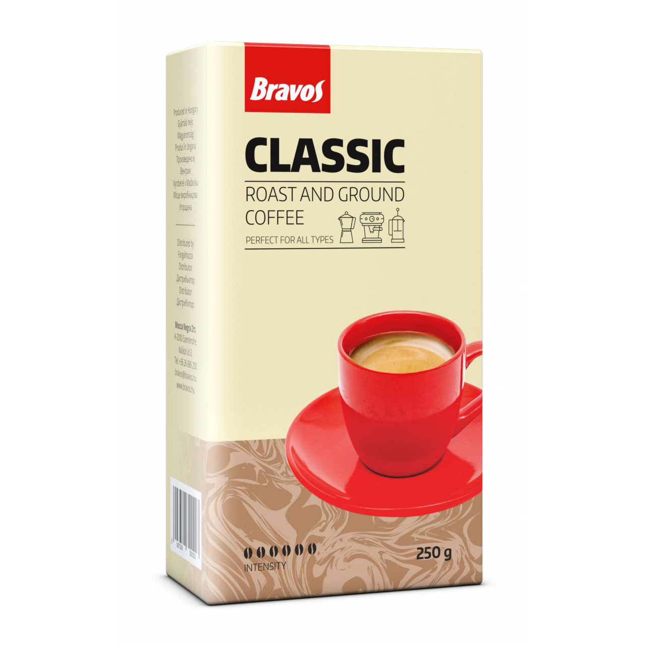 Кава мелений Bravos Classic — робуста, вирощена в Азії, Африці, Південній та Центральній Америці.Підходить для приготування на будь-яких кавоварках для традиційного еспресо.