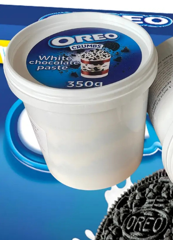 Біла шоколадна паста Орео Крамбс з Крихтами печива Орео - складається із шоколадного крему двох видів: зі смаком молочного шоколаду та ніжного білого. Чудовий десерт, який обов'язково сподобається як дітям, так і дорослим. Насичений біло-шоколадний смак у поєднанні зі вершковим стануть прекрасним доповненням до свіжого тосту на сніданок із молоком, чаєм або кавою, а також можна намазати на хліб або тости, використовувати при випіканні або просто їсти ложкою.